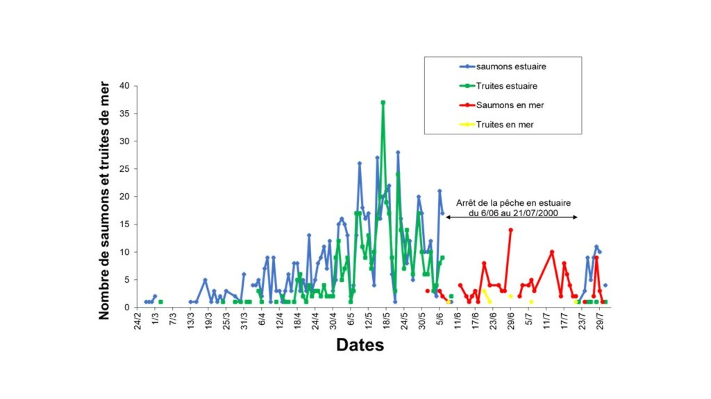 - captures effectuées essentiellement en juin, juillet et début du mois d’août par la flottille côtière, les saumons de printemps migrant visiblement plus au large et en lien avec un débit plus fort de l’Adour pendant la fin de l’hiver et le printemps;